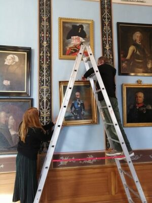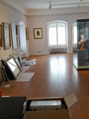 An den ersten beiden Tagen durfte ich beim Abbau der Sonderausstellung Alle Welt spielt helfen. Zeitweise war es mit Tetris vergleichbar, da die großzügig in Luftpolsterfolie gehüllten Exponate in Kisten verpackt werden mussten. Schlussendlich passte es, die erste Lieferung der Duckomenta stand aber auch schon vor der Tür. Nun hieß es also Aus- statt Einpacken. Die Sonderausstellungsräume füllten sich mit an die Wände gelehnten Gemälden – und Luftpolsterfolie. Durch den Anblick der vielen populären Persönlichkeiten, die als Enten gemalt wurden, gab es viel zu schmunzeln. Recht häufig hörte man auch „Das ist ja auch süß!“. Die gute Laune war quasi vorprogrammiert. In der Lieferung waren nicht nur Gemälde, sondern auch Repliken von Entenschädel enthalten, die der Entwicklung des Homo sapiens gleichen – die Schädel gehören zu meinen persönlichen Highlights. Nachdem die ersten Gemälde hingen, folgte die zweite Lieferung aus München. Neben weiteren Gemälden warteten auch Statuen, wie die Freiheitsstatue als Ente oder die Duckfretete darauf, von uns ausgepackt zu werden. Durch die Einbindung der Exponate in die Dauerausstellung wird der Ablauf der Geschichte gewahrt. Beim Schlendern durch das Museum fallen nicht alle anatiden Gemälde oder Gegenstände auf, da sie sich sehr gut in das Gesamtbild einfügen. Besonders auffällig ist dies in der fürstlichen Galerie, wo ein Großteil der Enten erst auf den zweiten Blick sichtbar wird.