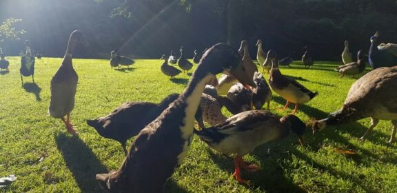 T: Als ich 2008 anfing hier zu arbeiten, hatten wir zwei Laufenten. Dann kamen immer wieder welche dazu. Zwischen fünf und acht Laufenten waren es in den letzten Jahren. Bis vor drei Wochen gab es allerdings nur noch drei Erpel. Nun sind drei Erpel und sechs Enten dazugekommen.