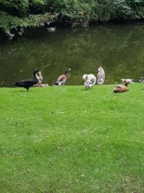 Maren: Was für Vögel gibt es eigentlich bei uns im Park, Thomas?Thomas: Wir haben 15 Laufenten, jede Menge Stockenten, Teichhühner und außerdem schwirrt hier immer ein Graureiher herum. Auch Kormorane und zeitweise ein Eisvogel kommen in den Park, dann haben wir im Frühjahr Heringsmöwen, das sind jedes Jahr zwei und da würde mich wirklich mal interessieren, ob es immer dieselben sind. Die kommen im Frühjahr, um sich die jungen Stockenten zu holen, die sie gerne fressen.