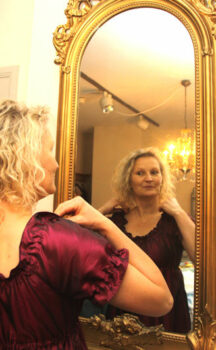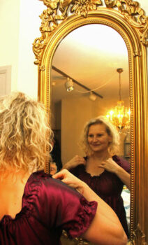 Die Kinderträume aus Stoff, Tüll und Spitze entstehen in der Schlossnäherei. Seit mittlerweile 15 Jahren treffen sich die sieben Frauen der ehrenamtlichen Schlossnäherinnen. Das Gründungsmitglied, Karin Dörjes, erinnert sich an die Anfänge: „Ich habe mit den Kindern Geburtstag gefeiert und nahm die Kleider anschließend mit zum Waschen nach Hause“. Doch irgendwann wurde es ihr zu viel: „Es blieb nicht beim Waschen, die Kleider mussten auch geflickt werden“.Aus den anfänglich kleinen Kleiderreparaturen wurde schnell die Nachfrage nach neuen Kostümen. Und das konnte und wollte Karin Dörjes nicht mehr allein bewältigen. Deshalb gab die ehemalige Handarbeitslehrerin eine Zeitungsanzeige auf. Daraufhin meldeten sich unter anderem auch die heutigen Mitglieder der Schlossnäherei. Die Nähwerkstatt war geboren. Mittlerweile treffen sich die Schlossnäherinnen zwei Mal monatlich in den Räumen der Museumspädagogik zum Klönen und zum Handarbeiten. Sie sammeln schöne Stoffe von Bekannten und Verwandten und auch Schmuck, Handschuhe und andere Accessoires, die man als Prinzessin brauchen könnte.