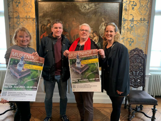 Das Schlossmuseum Jever präsentiert in Kooperation mit der Landesbühne Nds. Nord und dem Künstlerkollektiv „die bagage“ am So. 18., Fr. 23. und Sa. 24. Juni 2023 den MUSENHOF II. An vier Stationen erleben bis zu 250 Besucher*innen an drei Abenden einen bunten Reigen aus Tanz, Theater, Konzert und Gesang. Die Zuschauer*innen sind in 3 Gruppen aufgeteilt und erleben eine reisende Theatertruppe aus der Renaissance und phantasievolles Tanztheater im Schlosspark und ein barockes Chorkonzert im klangvollen Innenhof. In einer Pause werden leckeres Essen und kalte Getränke angeboten. Zum Abschluss präsentieren wir ein Konzert mit Rockballaden vor dem Schloss, das zum gemeinsamen Tanzen und Träumen einlädt. Partytime! Einlass ab 17.30 Uhr. Ende gegen 22.15 Uhr.