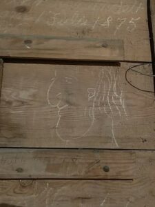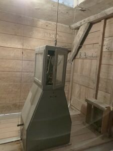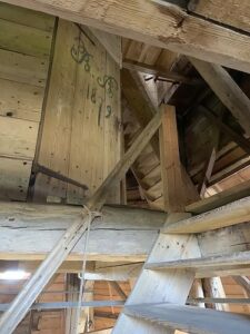 Die kleine Kammer ist ganz aus Holz gebaut. In der Mitte steht das heute nun elektronisch gesteuerte Uhrwerk. Seilzüge aus Draht führen in die oberen Turmstuben und stellen die Verbindung zum Ziffernblatt mit den Uhrzeigern her; aber auch zu den beiden Glocken, die aus den Jahren 1525 und 1639 stammen und die jede Viertelstunde angeschlagen werden. In der Kammer finden sich aber auch, wie im gesamten Gebälk der Turmhaube, interessante und spannende Inschriften. Schon an der Tür hat ein Handwerker die Initialen seines Namens „B A“ und das Jahr 1879, in dem er hier gearbeitet hat, hinterlassen. In der Kammer finden wir dann Inschriften vom späten 18. bis zum 21. Jahrhundert. Nicht nur die Uhrmacher haben sich hier verewigt, sondern auch Handwerker, die andere Teile des Turmes repariert haben oder einfach nur wagemutige Neugierige, die es ja in jedem Jahrhundert gegeben hat. Eine kleine Bank gibt dem Handwerker die Möglichkeit, hier oben eine Pause zu machen, die sicherlich immer etwas ganz besonderes war. So bequem mit einer Treppe gelangte man nicht immer in die Turmspitze. Bis ins letzte Drittel des 20. Jahrhunderts waren es eher Leitern und wackelige Holztreppen, die nach oben führten. Einige ältere Jeveraner erinnern sich vielleicht noch daran.