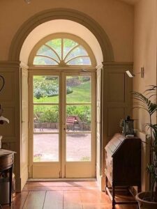 Man sieht es richtig vor sich: nach einer kleinen Lesestunde öffnet der Großherzog die Tür und steigt die wenigen Stufen hinab in den Garten seines Schlosses zu Jever. Hier erstreckt sich seit 1830 eine Parklandschaft im englischen Stil, die Elemente der alten Burganlage aufnimmt, aber auch durch die Modellierung der Flächen und der Art der Anpflanzungen die Natur im Kleinen abbilden will. Die Gartentür besitzt Glasfenster, auch im oberen Rundbogen, so dass das Gartenzimmer dahinter lichtdurchflutet ist und auch durch die Fenster, die ähnlich wie die Tür gestaltet sind, träumerische Blicke in den Schlosspark ermöglicht.