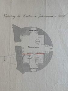 Der Eulenturm diente fortan friedlicheren Zwecken. So war hier in der zweiten Hälfte des 16. Jahrhunderts zeitweise das Konsistorium, also die evangelische Kirchenverwaltung für die Herrschaft Jever, untergebracht. Das heutige Gartenzimmer war damals im ersten Obergeschoss und die Gartentür war eine der Fensteröffnungen, die allesamt im frühen 19. Jahrhundert erweitert wurden. In dieser Zeit baute man ja das gesamte Schloss nach dem Geschmack und Bedarf der Oldenburgischen Herzöge bzw. Großherzöge aus, die seit 1818 das Sagen im Jeverland hatten. Der Eulenturm entwickelte sich zum privaten Wohnbereich der herzoglichen Familie. Die Wände und Fensternischen des Gartenzimmers waren mit Papiertapeten verziert; ein kleines Badezimmer abgetrennt. An der südwestliche Wand befand sich, im Fußboden versteckt, eine kupferne verzinnte Badewanne – was für ein Ausblick, wenn man dort genüsslich planschte. Ein Bleirohr führte das Badewasser durch den Keller in den äußeren Graben ab. Gefüllt wurde die Badewanne durch eine Röhrenleitung von der Küche aus. Über der Badewanne stand ein großer, auf Rollen verschiebbarer Diwan, der beim Nichtgebrauch die Badewanne versteckte.