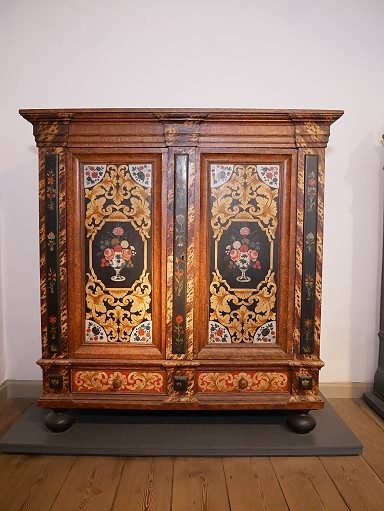 Farbige Möbel: Neben der Truhe, die im Mittelalter oft das einzige Bewahrmöbel war, lassen sich für die ost-friesische Küstenregion seit dem 17. Jahrhundert auch der Kleider- und Wirtschaftsschrank und die Anrichte nachweisen, zu denen dann im 18. Jahrhundert der Glas- und der Aufsatzschrank kamen. Neuere Forschungen haben belegen können, dass es neben den bekannten naturbelassenen Hartholzmöbeln einen einst gleichgroßen Bestand an bemalten Möbeln auch aus Weichholz gegeben hat und selbst Eichenmöbel mit Schnitzwerk farbige Fassungen besaßen.