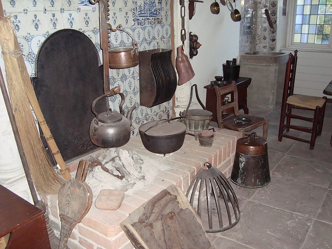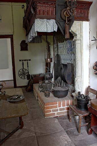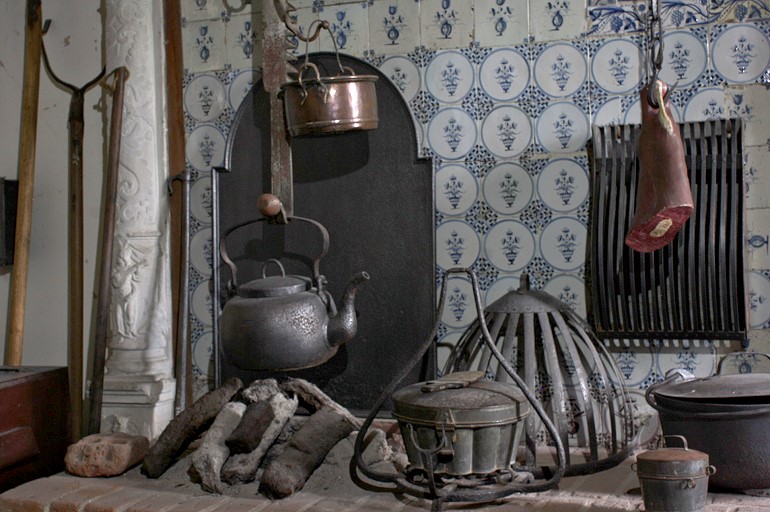 Das Bild der Küche wird von einem kaminartigen Herd mit Rauchfang bestimmt. Dieser Typ war während des 17./18. Jahrhunderts in Bauern- und Bürgerküchen gleichermaßen üblich und verkörpert die in Nordwesteuropa gebräuchliche Form. Die Herdstelle ist mit mobilem Zubehör wie Bratenwender, Feuerstülpe und Kesselhaken ausgestattet, wie es bis zur Übernahme des eisernen Kochherdes gegen Ende des 19. Jahrhunderts durchaus üblich war.