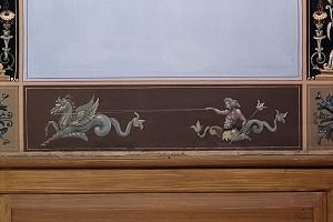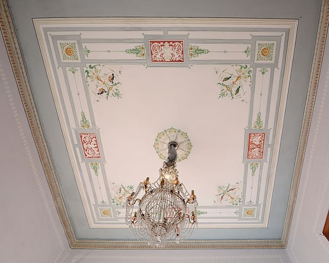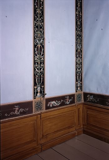 Bei den umfangreichen Erneuerungen um 1840 wurden sämtliche Räume der Belle Etage zeitgemäß ausgestaltet. Die kunstvolle Papiertapete aus dieser Zeit orientiert sich an dem antiken Stil, der durch farbig bebilderte Publikationen der Wandbemalungen pompejanischer Villen große Verbreitung fand.
