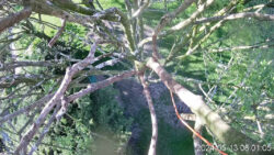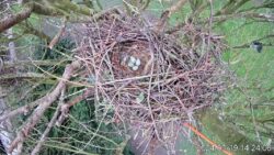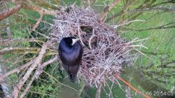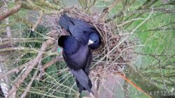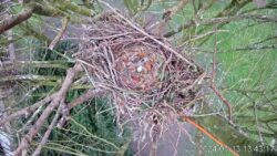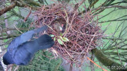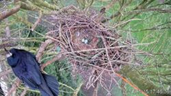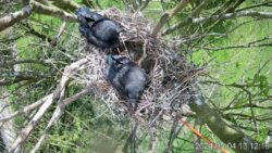 Nach der intensiven Phase des Nestbaus Anfang März legte „Mathilde“ – dieser Name wurde dem Weibchen in der ersten gefilmten Brutsaison gegeben – in diesem Jahr vier Eier. Drei Küken schlüpften, von denen eines bereits wenige Tage nach dem Schlupf verstarb, sodass zwei junge Saatkrähen heranwuchsen, die, nachdem erste Flugübungen auf dem Nestrand erfolgt waren, nun ausgeflogen sind.